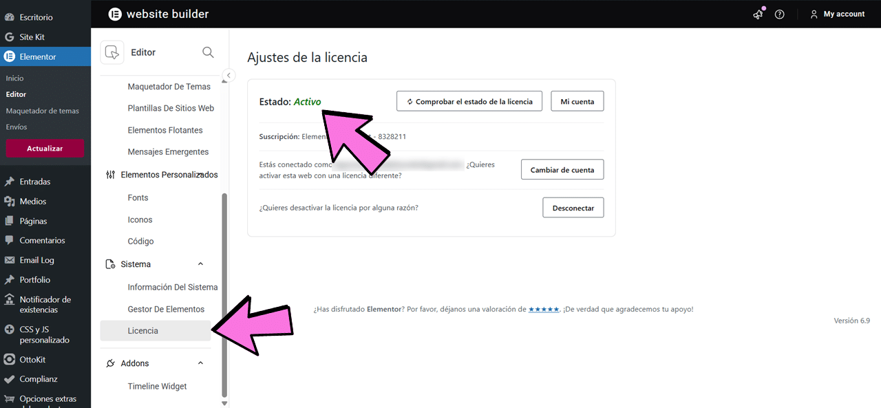 Si tienes una licencia oficial de elementor Pro, ésta debería mostrarse como Activa, pero ahora has de ir a Elementor / Editor / y buscar en el menú que se abre «Licencia» que está dentro de «Sistema«.