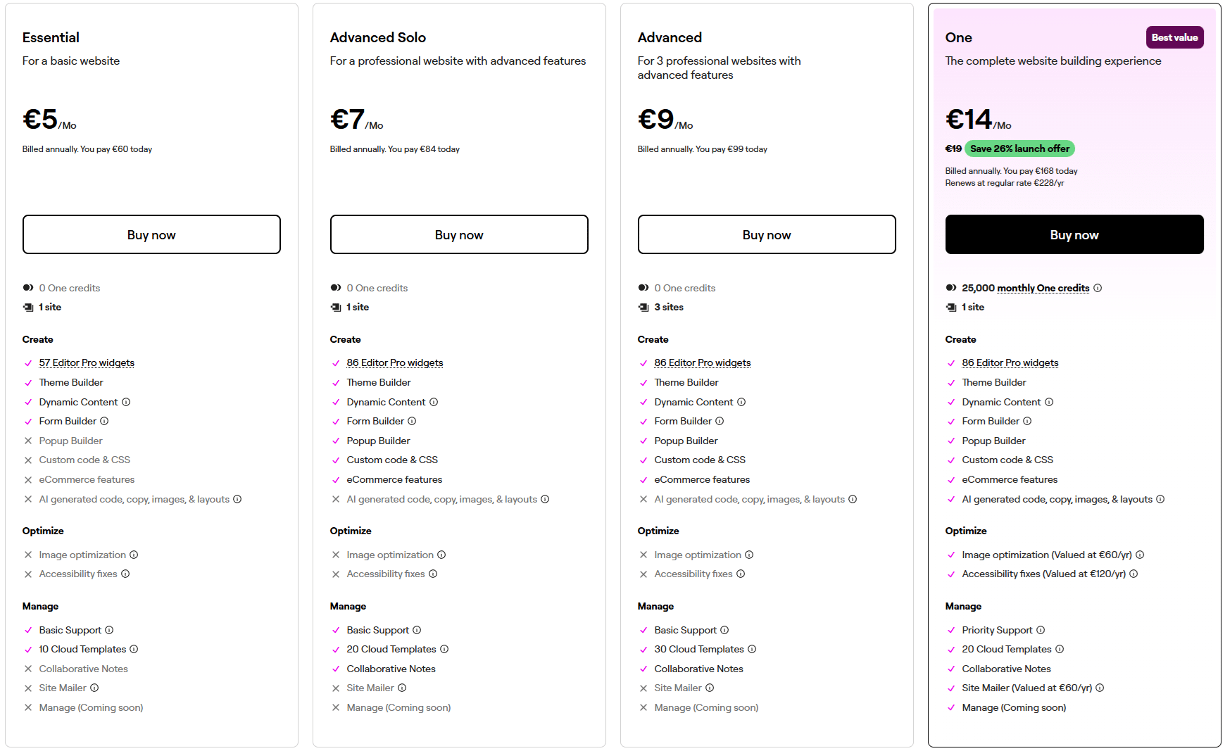 Actualmente, en la página de precios de elementor se siguen ofreciendo los mismos planes que antes, pero añaden el Plan One, por supuesto a un precio escandalosamente mas alto, nada menos que 228€ la renovación.